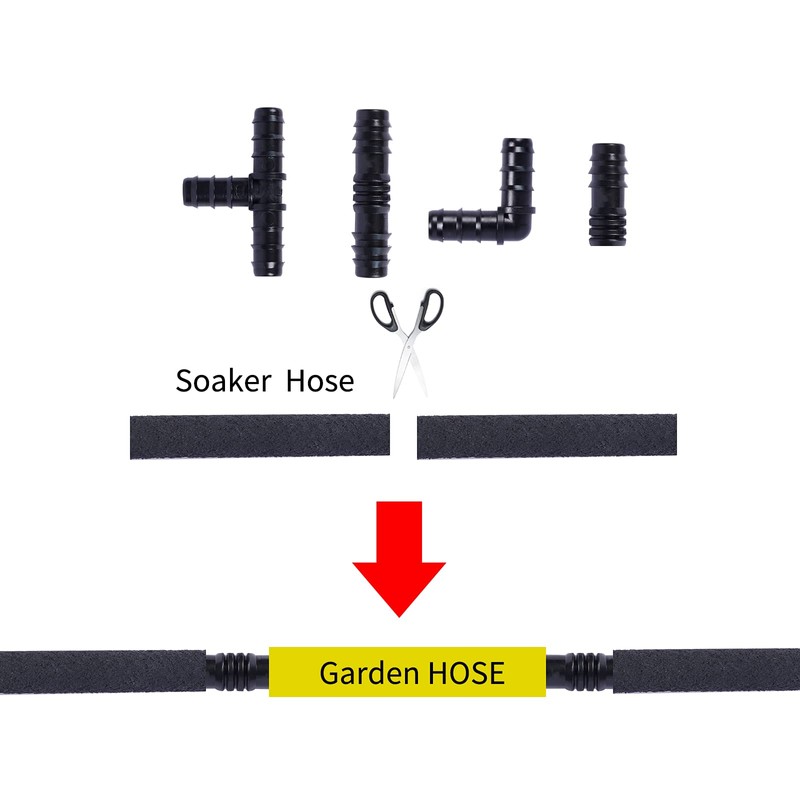 - Use these durable soaker hose fittings fittings to your connect 1/2" drip irrigation tubing. This 14-piece kit includes 2 Hose clamps,2 End Cap Plugs,2 Couplings, 2 Tees, 2 Elbows,2 pieces rubber washers and 2 pieces quick connectors