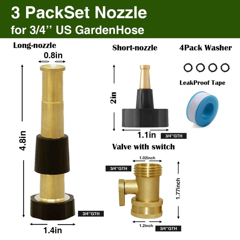 - Cost-Effective Nozzle Set: Includes 2 compact hose nozzle and one hose switch valve. All made of premium brass, heavy duty , lasting durable.Extra supply one switch valve for water on-off