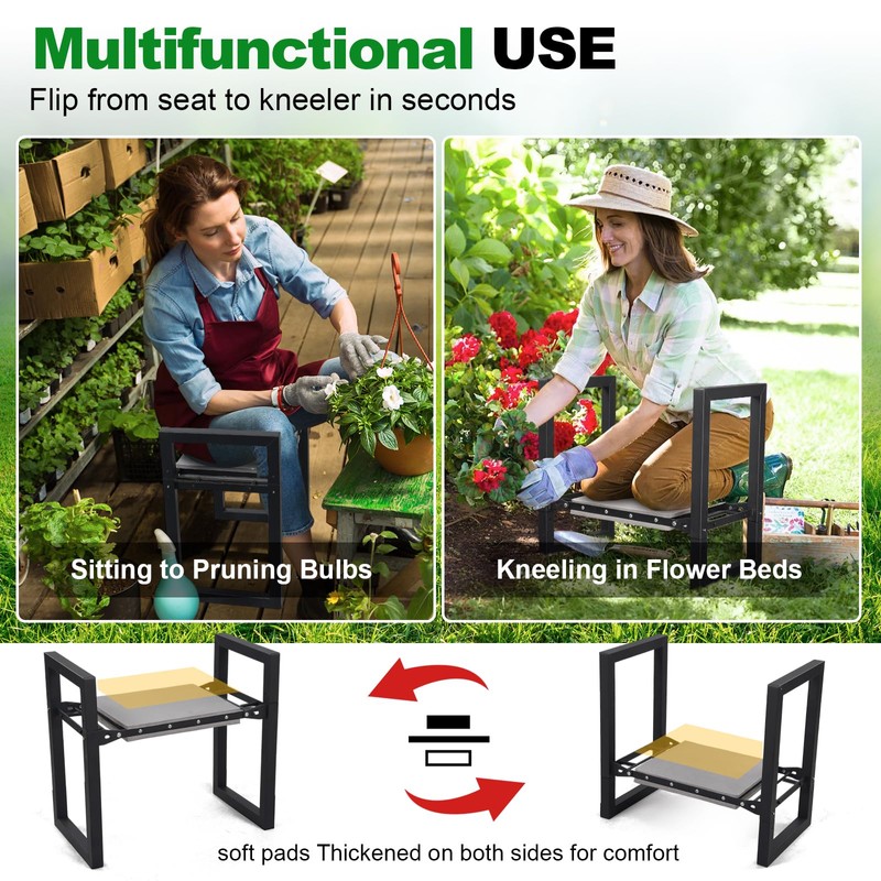 • 3-in-1 Gardening Bench Meets Indoor & Outdoor Multifunctional Use: Simply flip it over from a kneeling device for gardening to a garden chair, ergonomic long handle helps people with mobility/joint issues to stand up easily. Ideal for weeding, planting bulbs, pruning flower beds, harvesting tomatoes, scrubbing floors, cleaning baseboards, organizing low cabinets, bathing pets, playing with kids, etc.