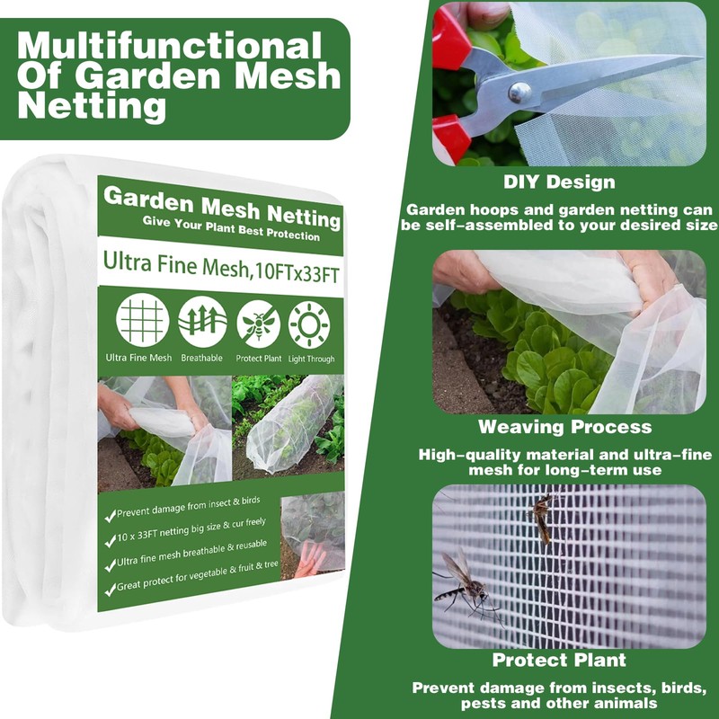- Ultra Fine Netting: Ultra-fine mesh is made of 0.8mm x 1mm heavy duty polyethylene,can excludes most insects, birds and animals, lasting long superior mesh mesh plant cover netting. It also maintains good breathability, allowing air, moisture and sunlight to circulate properly and providing a healthy living environment for your plants