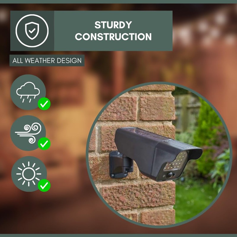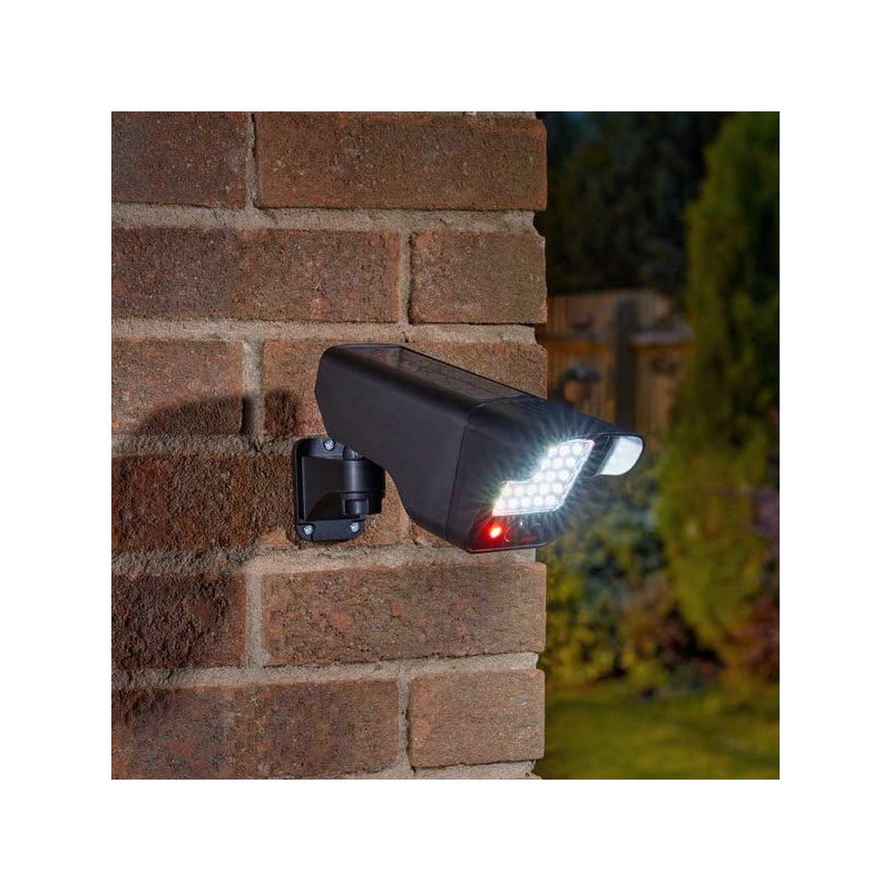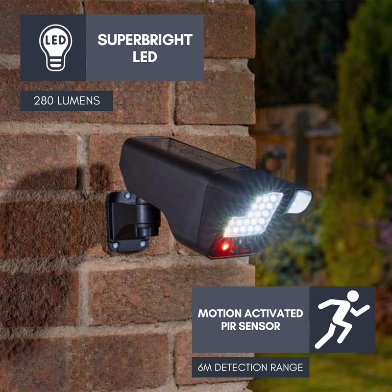 - The bullet dummy outdoor security camera is designed to look like a security camera to protect your home whilst also working as a solar security light. The light comes with 26 coole white LEDs and it is super bright with 280 lumens.