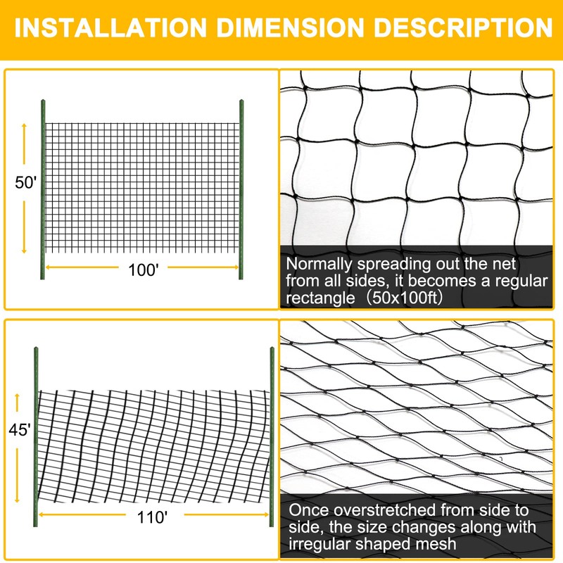 - 【Tips】When each side of the net is stretched evenly, the size of the net is 50ftx100ft and net is rectangular. But when one side is overstretched, the shape of the net will be irregular. For example, if the length is overstretched, the length will be greater than 100ft and the width will be less than 50ft, the shape of the net also will changes ( For details, please check the one of image in the Product Description ).