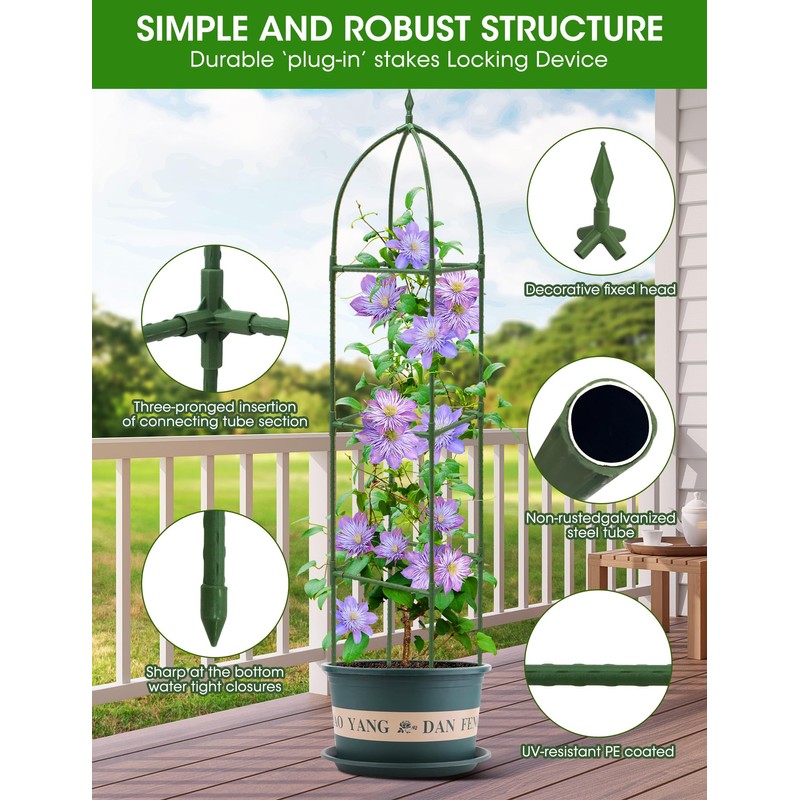 - 【Rust-proof Resistant Metal Trellis】Metal obelisk trellis poles are covered with a heavy-duty PE plastic coating to prevent rusting of the steel tubing inside, whether it's rain, sun or wind, this construction ensures long-lasting performance, making it a dependable choice for your four-season garden. Get optimal durability and stability, both indoors and outdoors, with this sturdy and plant-friendly structure!