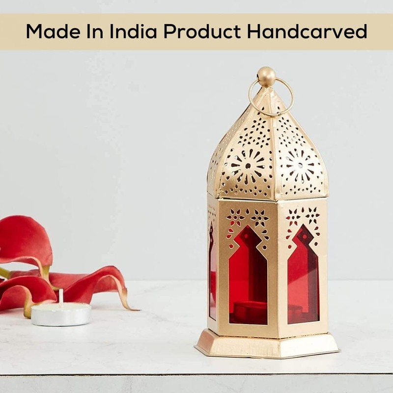 - Moroccan Color Gold Glass ,Red Iron Hanging/Table Lantern/Lamp Size : Height 17 Centimeter Width 8 Centimeter Weight 180 Grams Designer Lanterns Handmade Made In India Product Handcarved