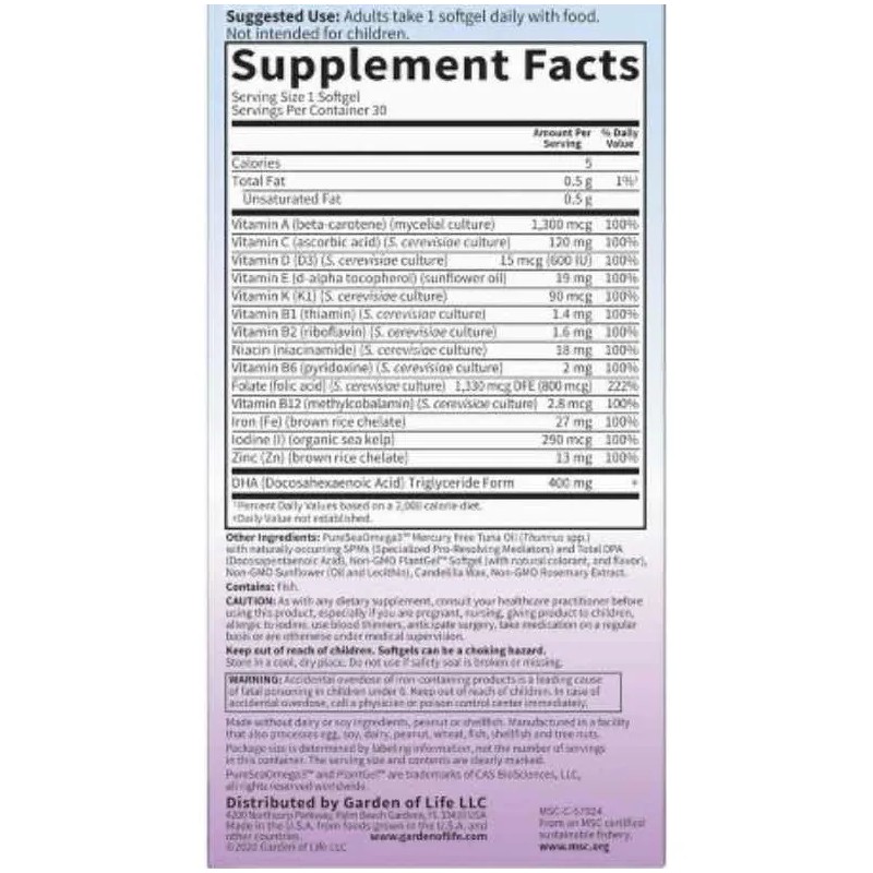 Garden Of Life Prenatal Multi + Dha 30 Softgels Sabor Sin Sabor