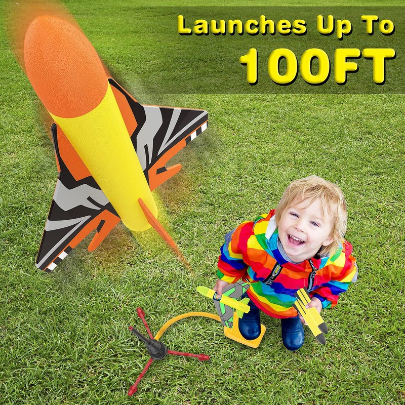 - Bring Stars to the Night Sky -- Even in the dark night with our light rockets that are great! There are 2 of our rocket toys that have internal LED light it gets activated with vibration. Bring more outdoor fun to the night. In addition to the glowing rockets, our rocket launcher kit also has other airplane rockets that have a unique shape of their wing so they can land with a special gliding effect!