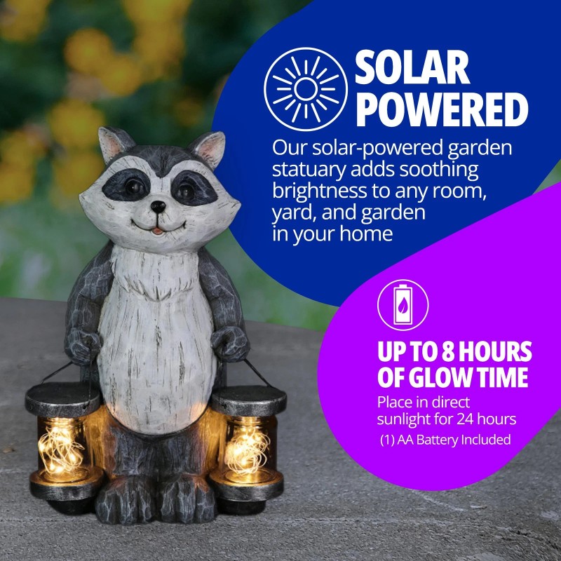 RACCOON GARDEN STATUARY: Add a touch of adorable charm and enchantment to your garden decor with the Raccoon Solar Garden Statue; crafted from durable resin and meticulously hand painted, these solar garden decorations are an excellent way to add cute and whimsical decor and soothing accent lighting to your outside garden, front porch, patio, lawn, or yard