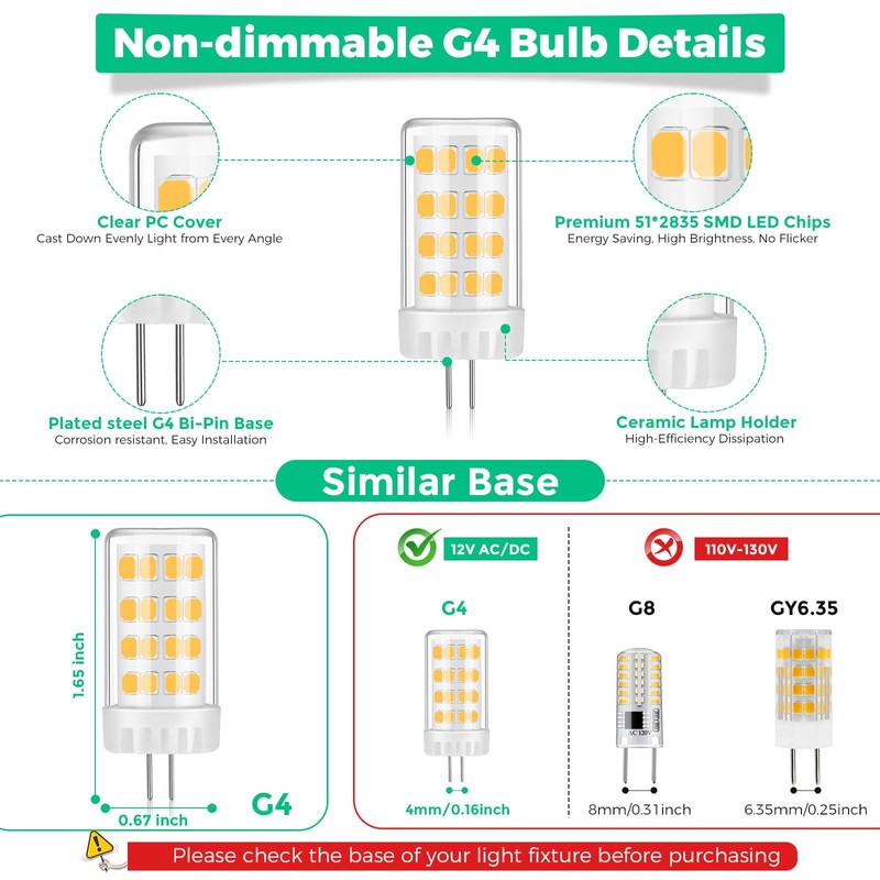 - 【EXCELLENT PERFORMANCE】G4 LED bulb is made of polycarbonate housing and ceramic base with G4 standard Plated steel G4 Bi-Pin base,waterproof and moisture-proof, 3000K warm white, 480 lumens, with high quality 51*2835 LED chips, energy saving, high brightness. Non-dimmable, do not use with dimmers or unstable 12 volts or the bulb will flicker or make noise