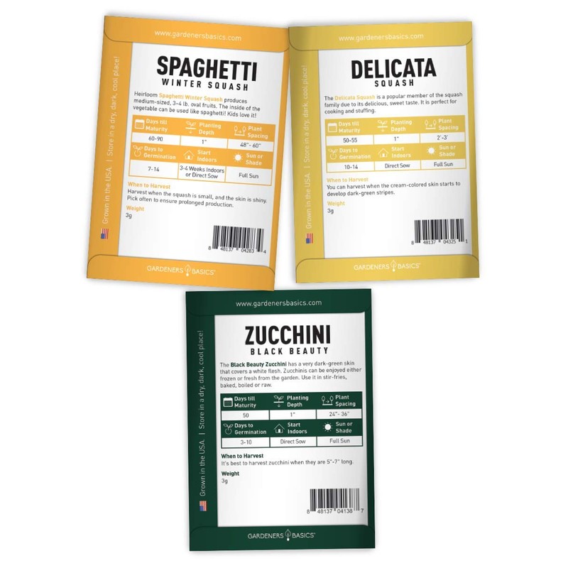 Our squash starter kit gives you one seed packet of 5 different vegetables commonly used in summer squash gardens. Each variety pack will include 1 of each of the following vegetable seed packets:Delicata Squash Seeds 3 GramsGolden Crookneck Seeds 3 GramsWaltham Butternut Winter Squash Seeds 3 GramsBlack Beauty Zucchini Seeds 3 GramsSpaghetti Winter Squash Seeds 3 GramsAll the seeds you need to grow 5 different varieties of squash seeds. Squash is notoriously easy to grow for both new gardeners and experienced alike. Squash tends to be prolific, providing you with a bounty all summer long. The more you pick, the more it produces.Why We LOVE Squash:* Making bread* Stir - Fry* Roasted* Pasta replacement* Soups and Stews* Throwing in a green smoothie* Fun varieties hard to find in the storeZucchini is very fun to grow and harvest. You can start your squash indoors a few weeks before the last frost. You can also direct sow them into your garden.Whether you are a beginner gardener or your 20th year growing, you will love how easy these squash plants are to care for and grow. There is so much joy that comes from gardening and growing your fresh vegetables and herbs.We've picked heirloom, non-GMO, open-pollinated varieties that will grow well across the country and will grow well for you.All of our seeds proudly come from USA growers. They are heirloom, non-GMO seeds. Since they are heirloom seeds, you can save seeds from your garden this year and use them in your future gardens. You are providing cost savings to your family.We are positive you will love our grow your rare squash kit, but if for any reason you are unsatisfied, please contact us.