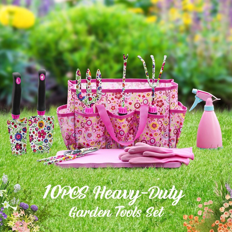 Housolution Gardening Tools Set, 10 PCS Stainless Steel Heavy-Duty with Non-slip Soft Rubber Handle with Large Garden Bag, Floral Pattern Gardening Tool Set Gifts for Women Birthday Mother's Day, Pink