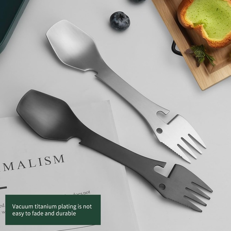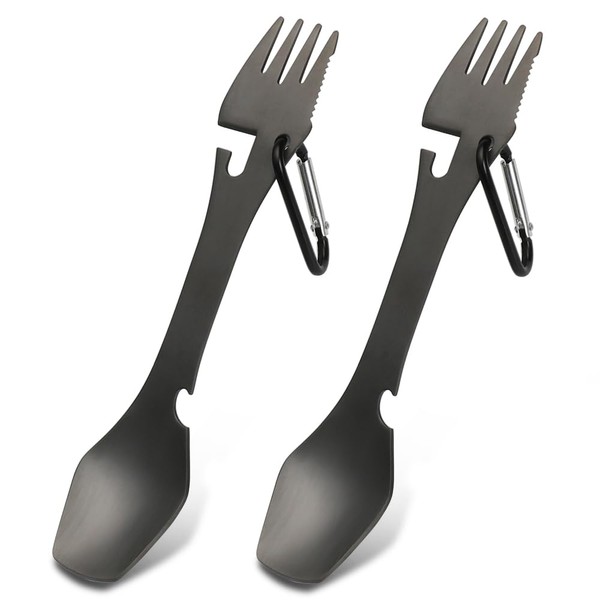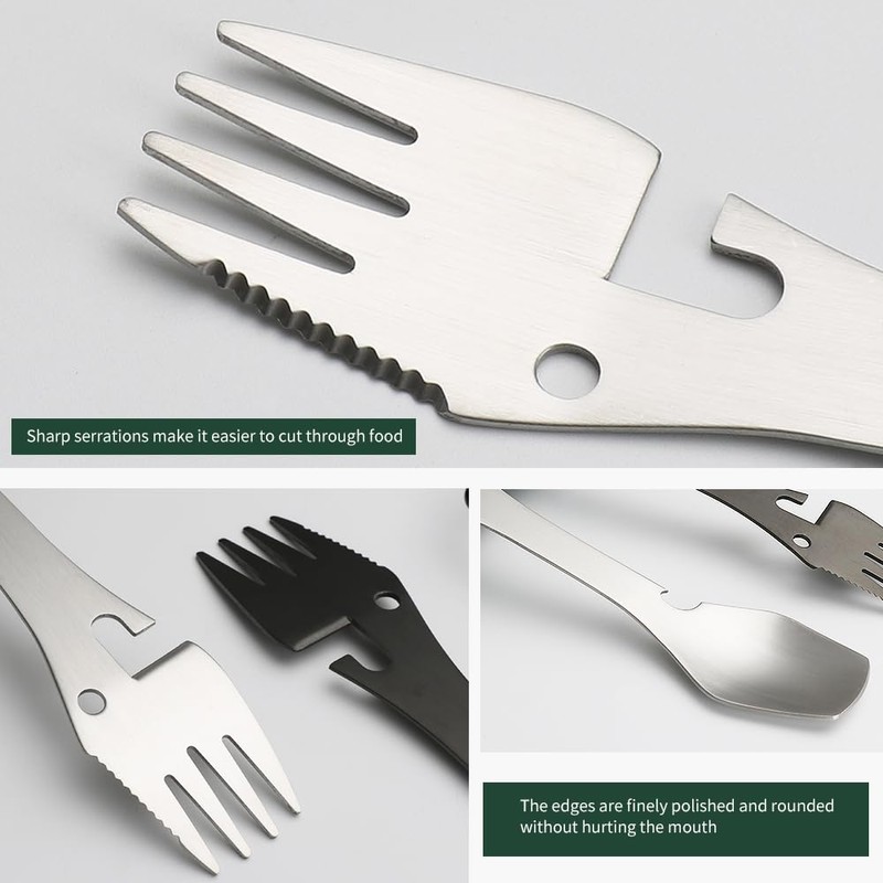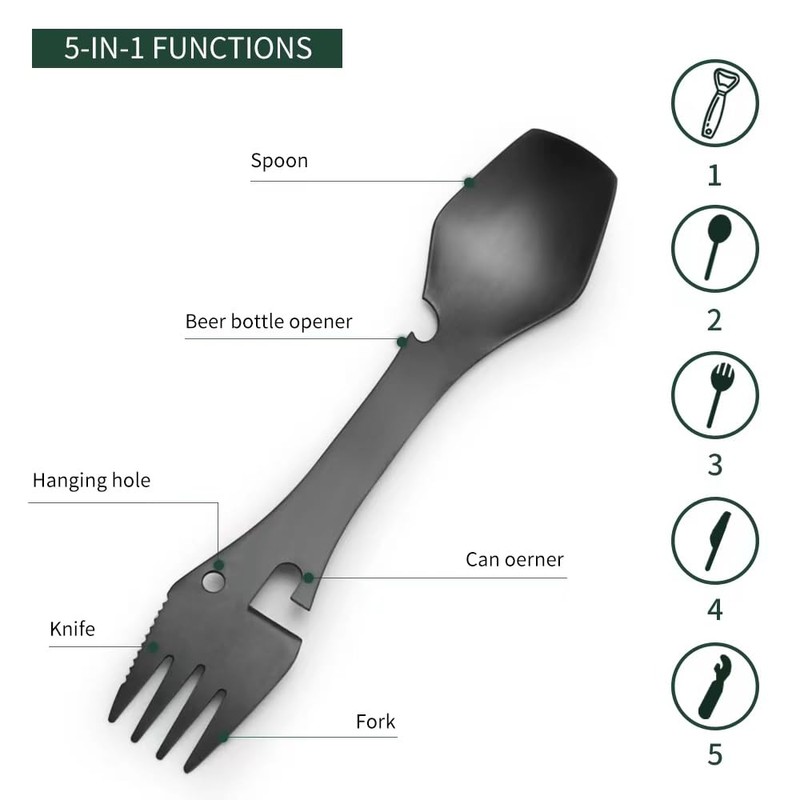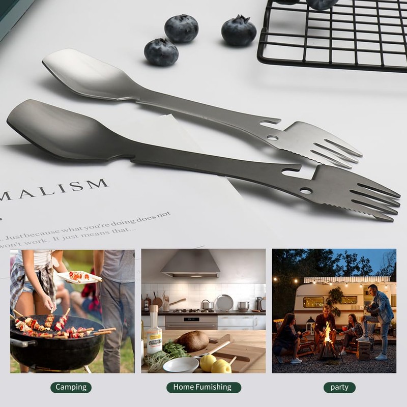 - 5-in-1 function: This is an 5 in 1 camping utensil: camping spoon, camping fork and knife,bottle opener, and can opener,One set includes 2 portable 5-in-1 multi utensil and 2 "D" shaped hooks.