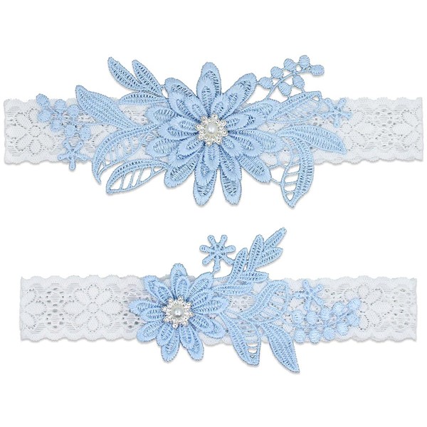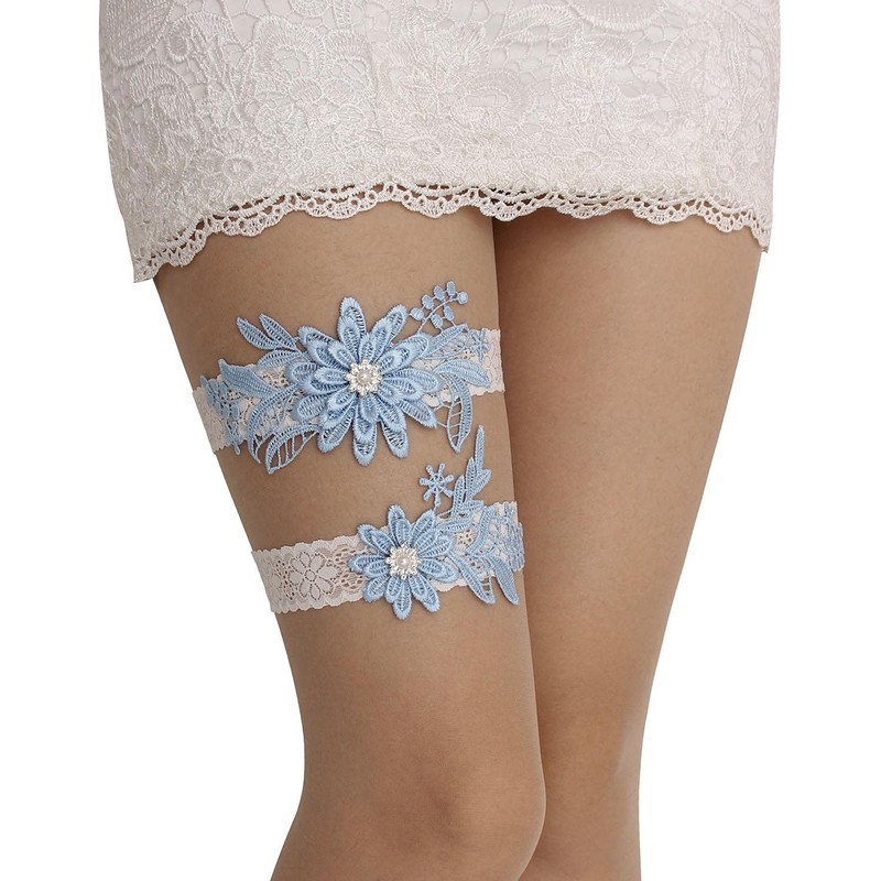 GARGALA Juego de ligas de encaje para novia con piedra de rinoceronte y perla, Azul/claro, M
