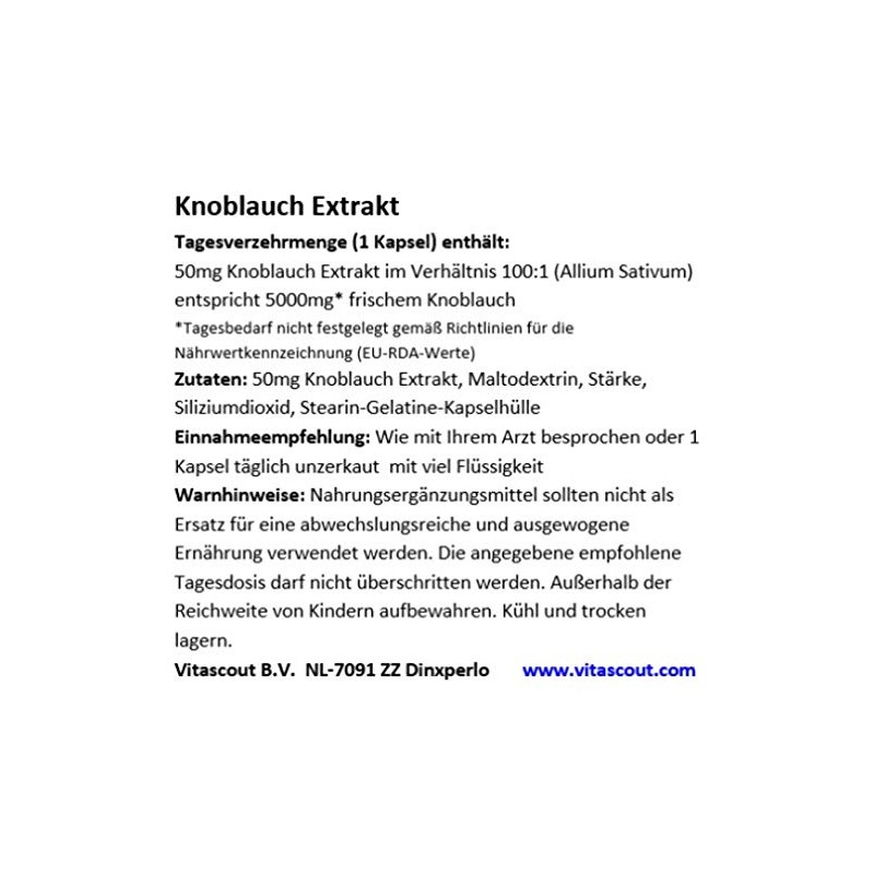 - High-dose extract product: 50 mg garlic extract in a ratio of 100:1 (Allium Sativum) corresponds to 5000 mg of fresh garlic