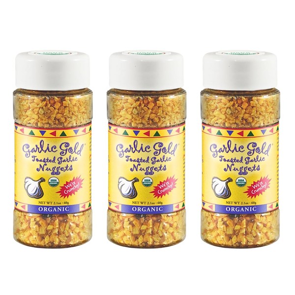 Garlic Gold Toasted Garlic Nuggets, Crunchy Roasted Garlic Seasoning, USDA Certified Organic Salad Topper, Keto Paleo Friendly (2.1 Ounces, 3 Pack)