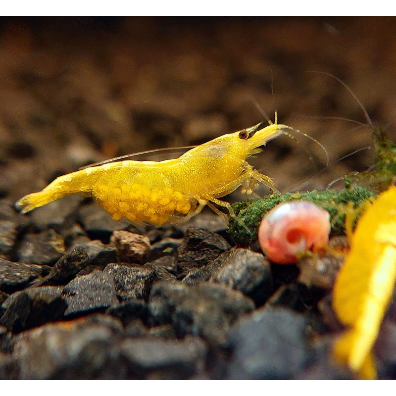 Note: Yellow Neocaridina shrimp can temporarily have a greenish appearance due to the spirulina content with frequent feeding.