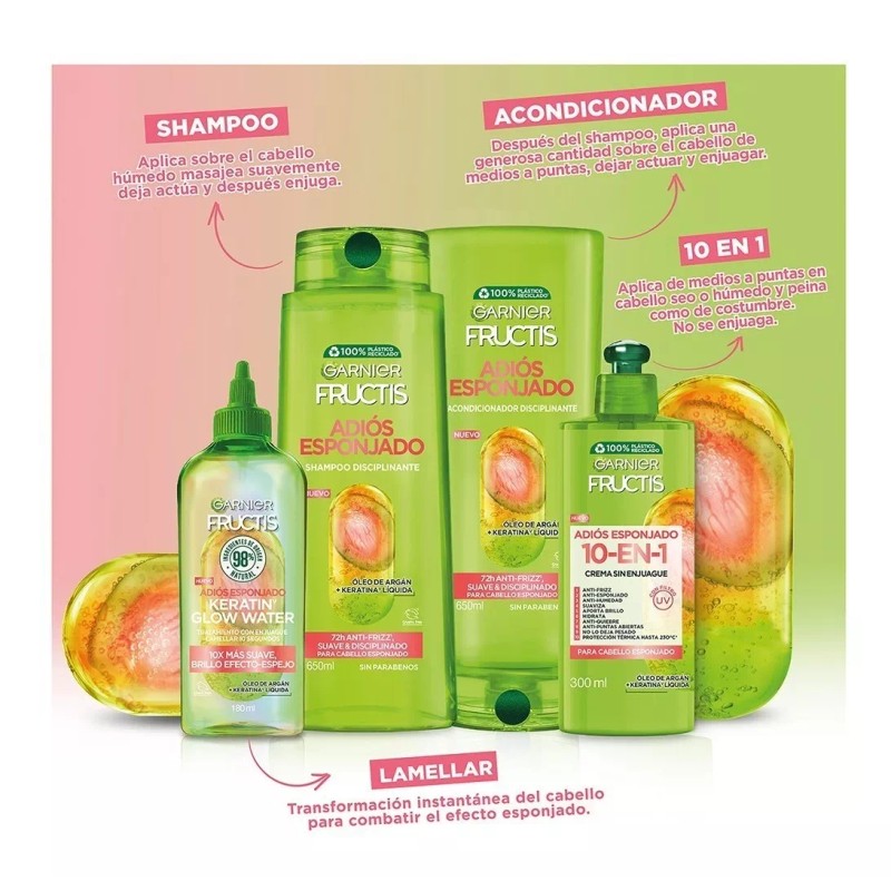 Crema Para Peinar 10 En 1 Garnier Fructis Adiós Esponjado 300 Ml. Enriquecida con un super dúo de ingredientes especialmente diseñados para cabello esponjado. Proporciona hasta 72 horas de control Antifrizz, dejando tu cabello suave y disciplinado. Libre de parabenos y aceites minerales. Las botellas están hechas con plástico 100% reciclado.