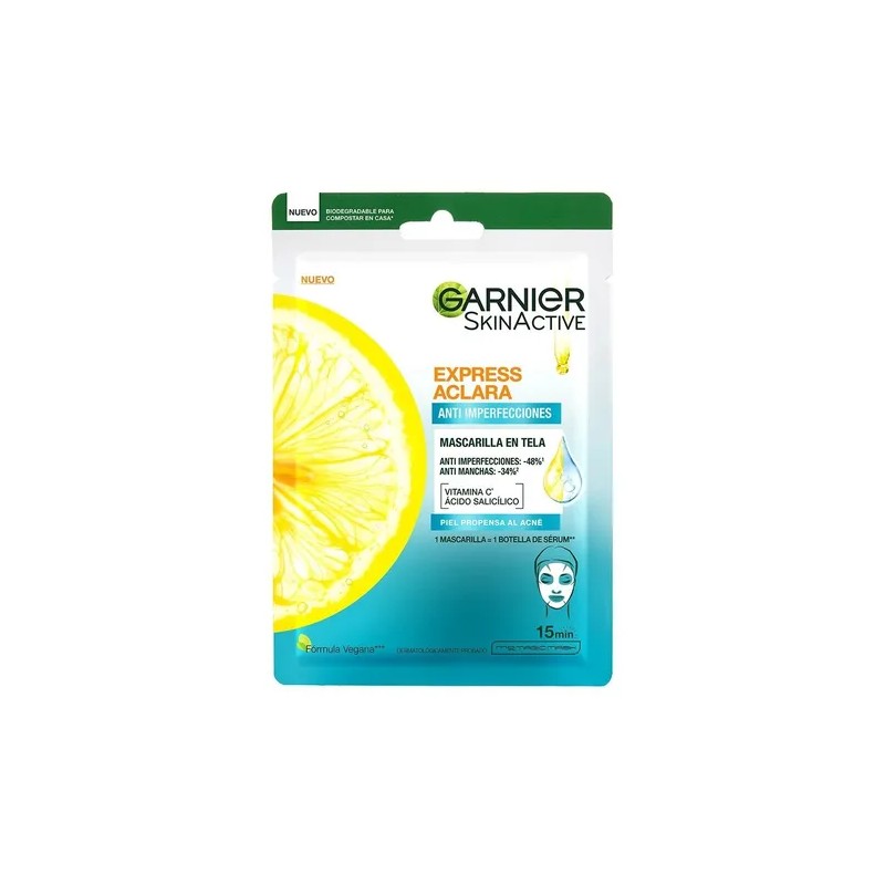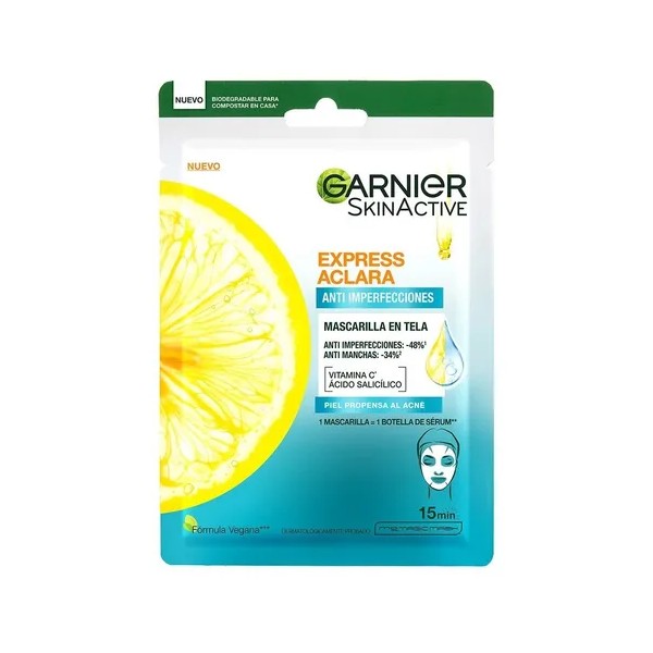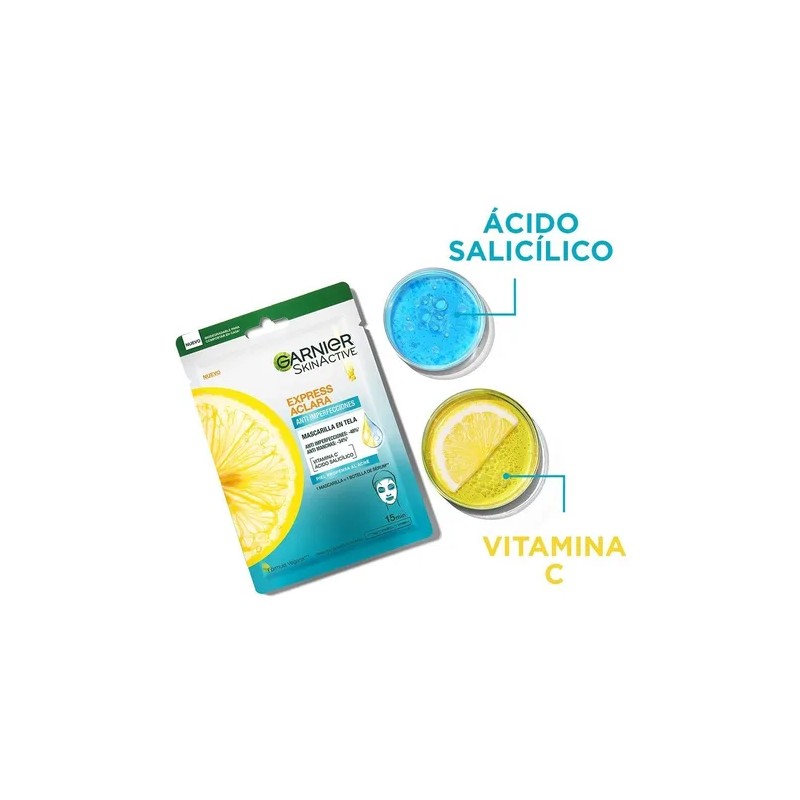 Nueva Mascarilla en tela anti imperfecciones Express Aclara, para una piel uniforme y visiblemente reducción de imperfecciones, enriquecida con vitamina C + ácido salicílico.