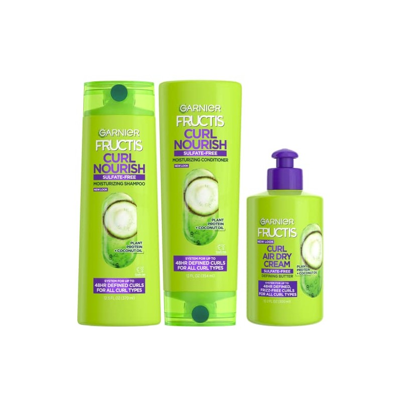 Garnier Fructis Curl Nourish Sulfate Free Moisturizing Shampoo, Conditioner + Air Dry Cream Defining Butter Set (3 Items), 1 Kit (Packaging May Vary)