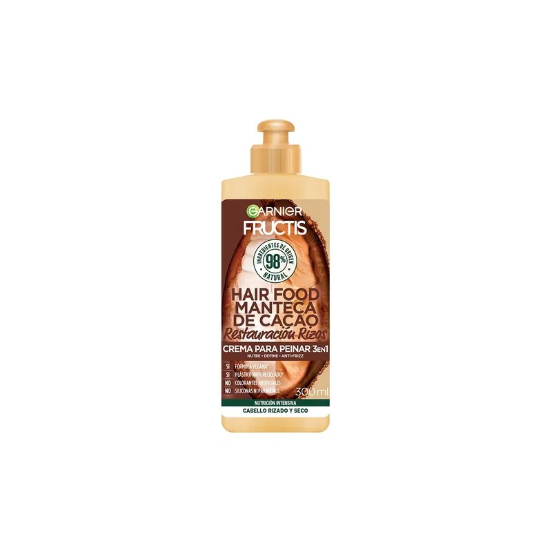 ¡Nutre y define tus rizos sin apelmazarlos! 🌟 La Crema para Peinar Garnier Fructis Hair Food Manteca de Cacao es un tratamiento 3 en 1 que proporciona nutrición intensa, definición y control del frizz hasta por 72 horas. Con 98% de ingredientes de origen natural y fórmula vegana, es ideal para cabello rizado y seco.