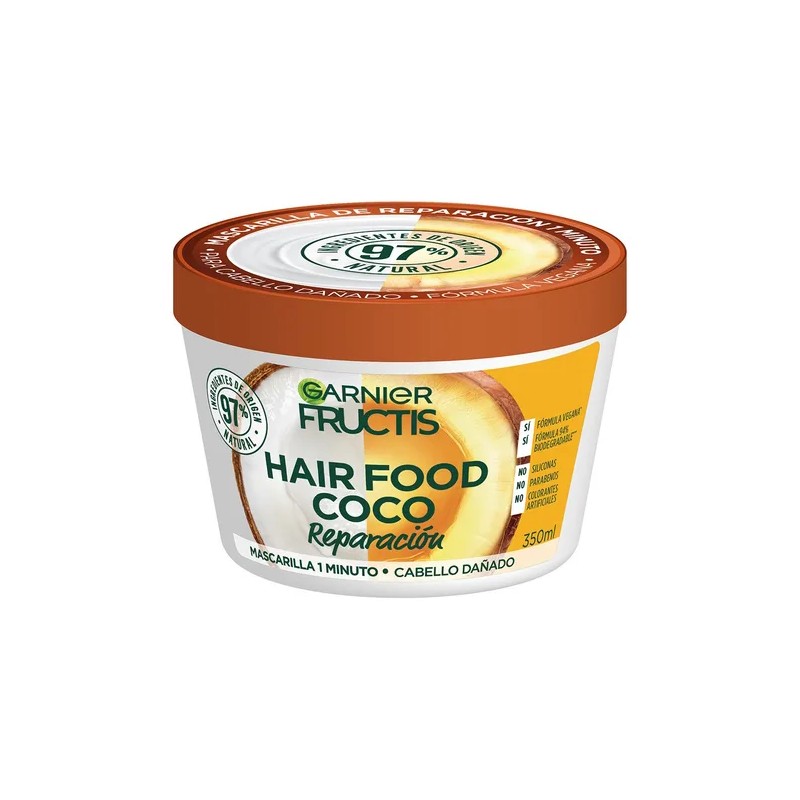 ¡Repara tu cabello dañado en solo 1 minuto! 🌴 La Mascarilla Garnier Fructis Hair Food Coco, con 98% de ingredientes de origen natural y fórmula vegana, nutre profundamente, suaviza y devuelve el brillo natural a tu melena. Ideal para quienes buscan una solución rápida y efectiva para el cabello seco y maltratado.