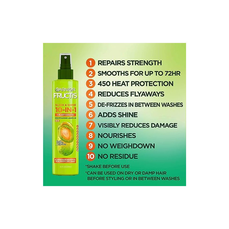 - Garnier Fructis Sleek and Shine: Our lightweight multitasking spray cuts your haircare and styling routine into just one step to tame frizzy, dry hair. Non-greasy, non-sticky, and non-oily hair treatment formula