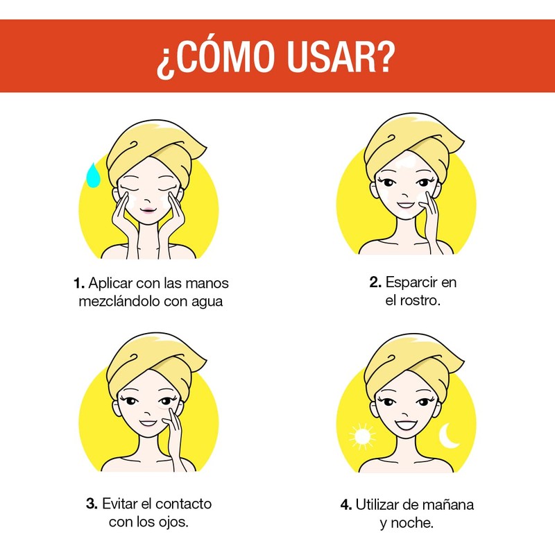 • Aplicar con las manos con un poco de agua y esparcirlo en el rostro evitando el contorno de los ojos, masajear directamente, enjuagar y secar, utilizar de mañana y noche