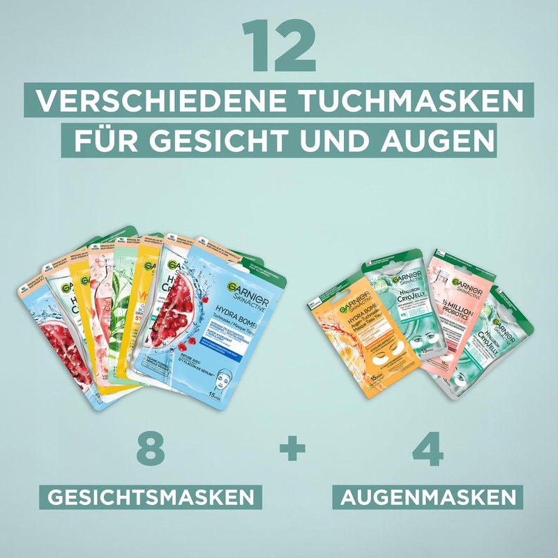- Box contents: 1 x Garnier cloth mask set with 12 different cloth masks for every skin need, varieties: Hydra Bomb, Cryo Jelly, Vitamin C, 2 Million Probiotics