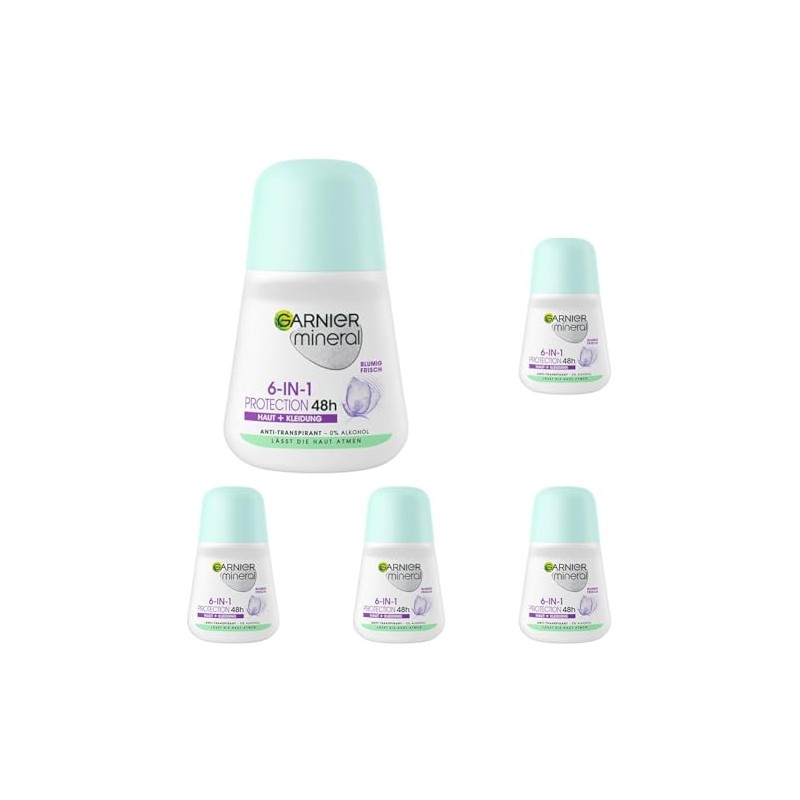 Garnier Roll-On Deo für Frauen, Deodorant mit frischem Duft und bis zu 48 Stunden Schutz vor Achselnässe und Körpergeruch, Mineral Protection 6in1 Anti-Transpirant, 1 x 50 ml (Packung mit 5)