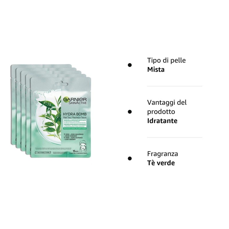 Garnier SkinActive, Hydra Bomb super-hydrating and mattifying sheet mask, For combination or oily skin, Green tea, Pack of 5