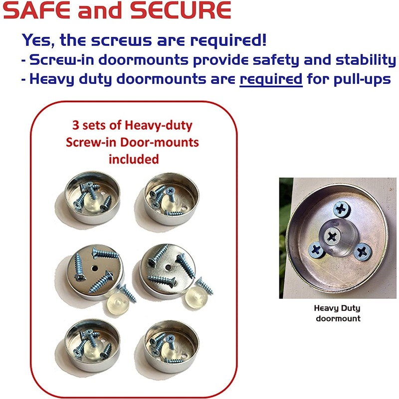 - Safe and Secure - Heavy-duty chrome steel doorway pull up bar and door mounts provide great support and safety. Note: Always install and use the supplied screw-in door brackets (comes with 3 sets of heavy-duty door mounts)