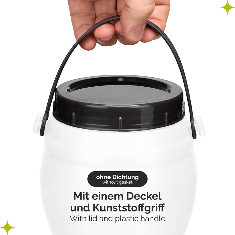 - VERSATILE STOCK PLASTIC WITH LID - Ideal for water, juice, wine and various liquids such as soaps or chemicals. Also perfect for dog food storage.