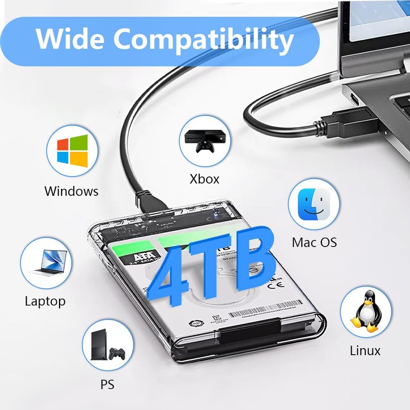 • 2.5" External Hard Drive Enclousre: Easily connects your 2.5 inch SSD & HDD to PC, laptop, PS4, Xbox for data transfer or expanding storage. It protects the hard disk from outside scratches and makes SATA hard drive portable for data store. It is awsome for booting up old hdd/ssd and recovering important files of broken PC.
