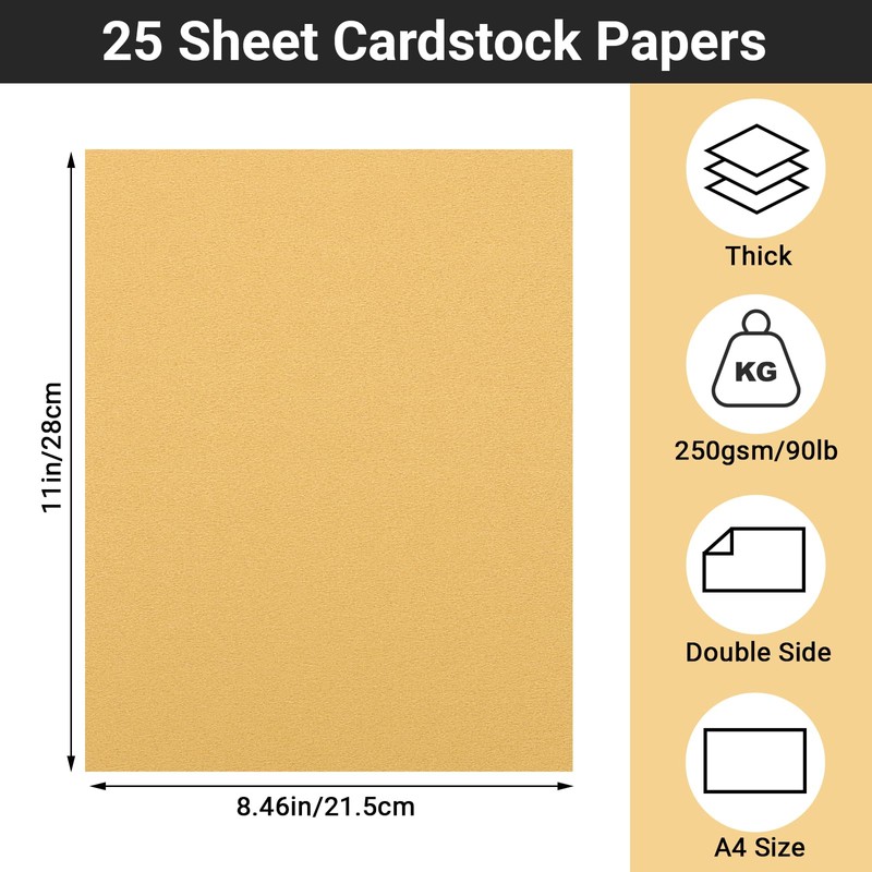 - SPECIFICATION - 25 Sheets Gold shimmer cardstock paper, sufficient quantity, meet almost all your printing and various card making needs.Standard A4 size - 8.5 x 11 inch, weighs 90 lb / 250 gsm, thick and sturdy, no tearing and bending.