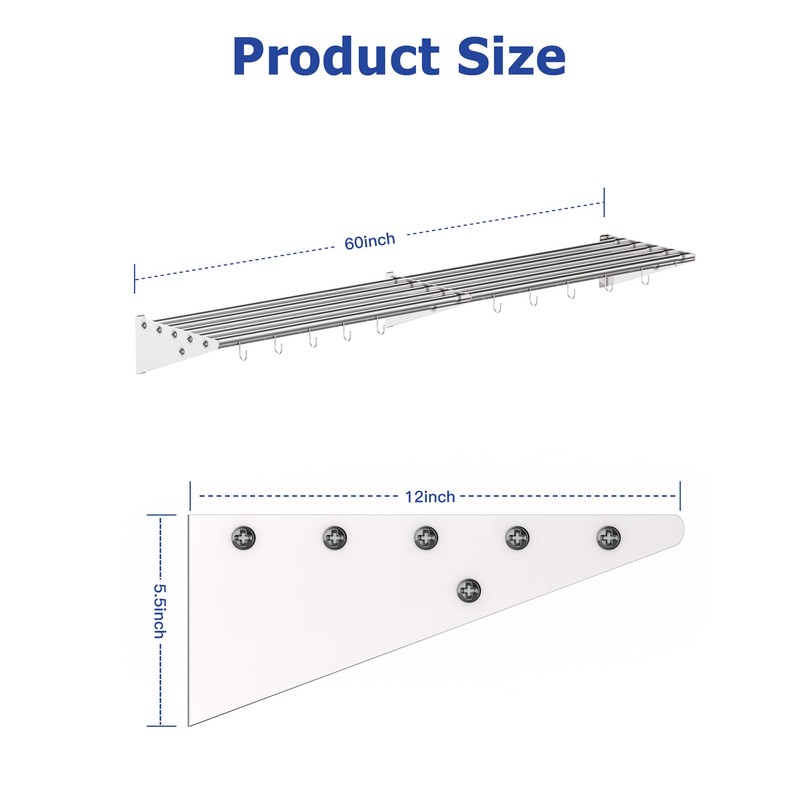 Garvee 12" x 60" Stainless Steel Shelf Pot Rack NSF Certified 210lb Metal Wall Shelf with 10 S Removable Storage Hooks for Kitchen Storage & Organization Durable Pot Holder