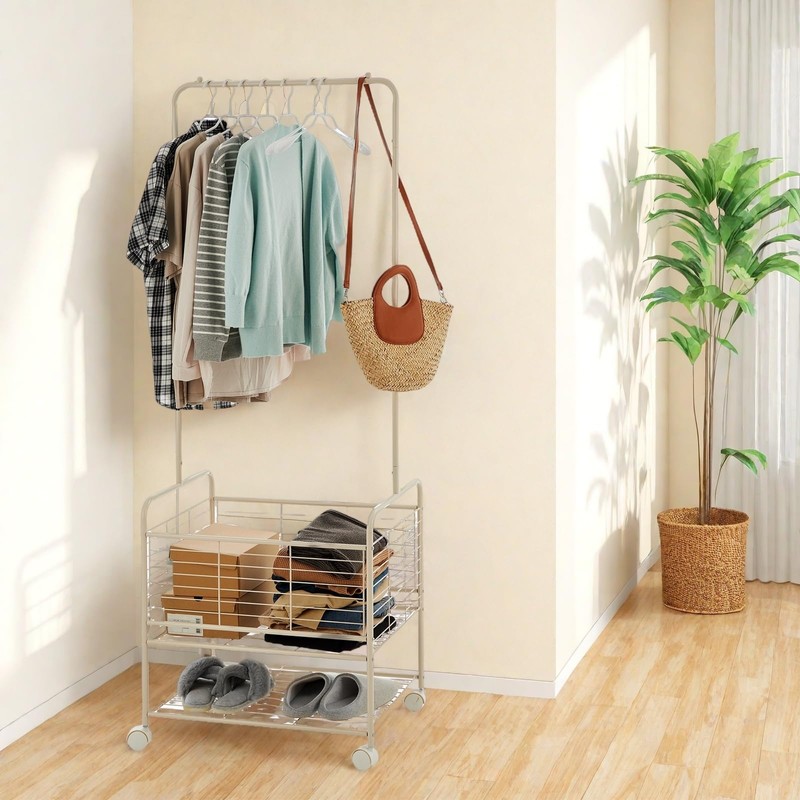 Garvee Laundry Cart with Hanging Rack, Metal Rolling Laundry Hamper with Storage Basket and Shelf, Clothes Storage Organizer with Wheels for Small Spaces Apartment, Beige