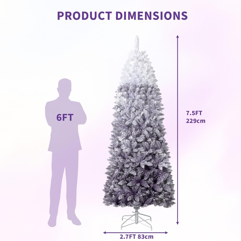 GarveeHome 7.5ft Snow Flocked Pencil Christmas Tree, Slim Artificial Christmas Tree with Sturdy Metal Stand, Skinny Xmas Tree Holiday Decoration for Home, Office, Purple Gradient
