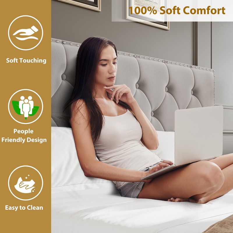 A Bed Looks Luxurious: Upholstered bed frame with tufted buttons and handcrafted inlaid metal rivets, every detail is made with care. Silky-smooth velvet fabric which is not only supremely soft and comfortable but also incredibly long-lasting. Bed frame with headboard looks low-profile and exquisite, perfectly offering your bedroom a luxurious ambiance and relaxation.