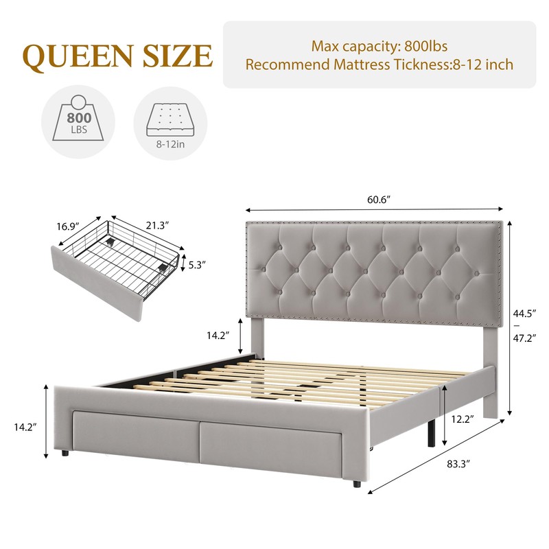 - A Bed Looks Luxurious: Upholstered bed frame with tufted buttons and handcrafted inlaid metal rivets, every detail is made with care. Silky-smooth velvet fabric which is not only supremely soft and comfortable but also incredibly long-lasting. Queen bed frame with drawers looks low-profile and exquisite, perfectly offering your bedroom a luxurious ambiance and relaxation.