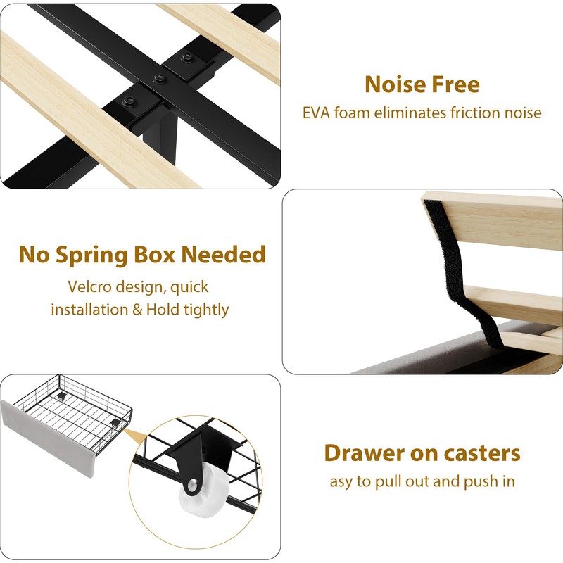 Bed Frame with Storage: Queen bed frame with 2 drawers gives you practical storage space, storage drawers are easy to roll out and in thanks to the castors on the base.Perfect for storing clothes, pillows, and bed linen.