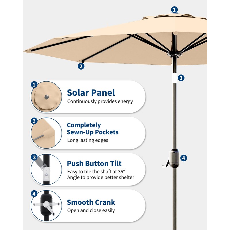 GarveeLife 10 Ft Patio Umbrella with Solar Lights, Outdoor Table Umbrella with 40 LED Lights & Tilt Crank, 8 Ribs Market Table Umbrella for Pool, Deck, Backyard, Tan