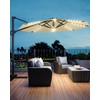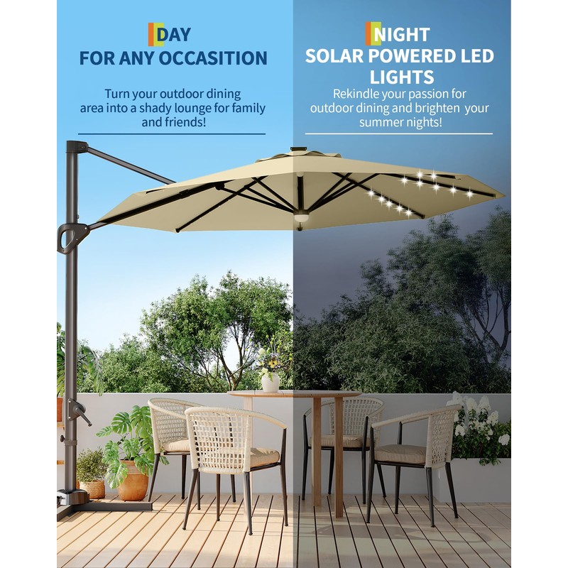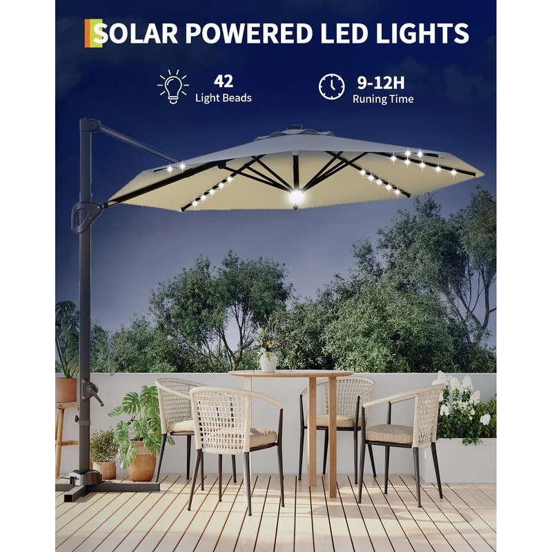 GarveeLife 10FT Cantilever Umbrella Outdoor Patio Umbrella Solar LED w/Base Included Market Offset Umbrella Sun Shade Windproof with 360-Degree Rotation for Patio Garden Deck Pool, Beige