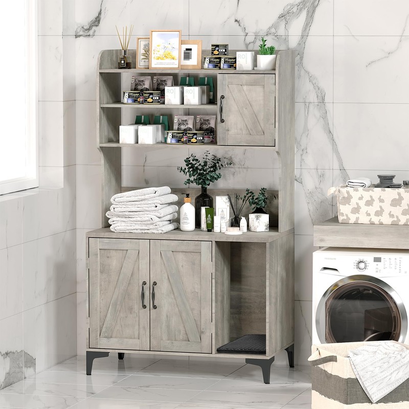 GarveeLife Cat Litter Box Enclosure With Shelves,Hidden Litter Box Furniture,Cat Litter Box Cabinet,Hidden Cat Box Furniture With Scratching Mat,Wood Sturdy Cat Washroom Storage, Indoor Cat House,Grey