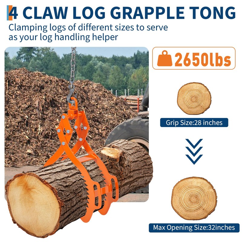GarveeLife Log Lifting Tongs 28 Inch 4 Claw, Log Grapple Logging Tongs with 4 Serrated Claws, 2650LBS Capacity Heavy Duty Claw Hook for Tractors, Trucks, Forklifts, ATV Logging, Lumber Handling