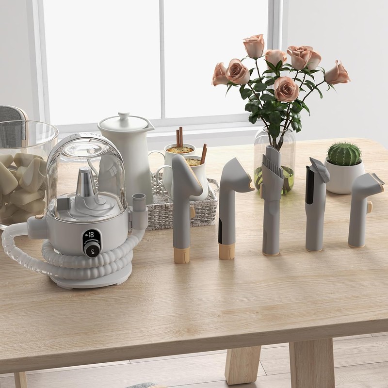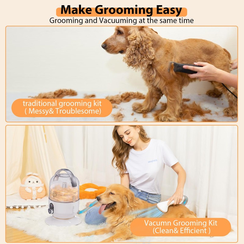 - 6-in-1 Professional Pet Grooming Kit:Dominate Every Grooming Task with Precision Tools.Includes 2-in-1 flat suction nozzle (deep cleaning + narrow crevice access), electric clippers (3-speed trimming), slicker brush (detangling), deshedding tool (targeted hair removal), polishing brush, and flexible hose for multi-angle cleaning. Perfect for daily maintenance, seasonal shedding, and styling