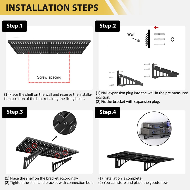 - Easy to Install: The Wall Shelf Garage Storage Rack components are independent and tightly connected, easy to disassemble and install, and can be installed in parallel or vertically according to the wall space, suitable for wooden walls and brick-concrete walls (Including all necessary hardware)