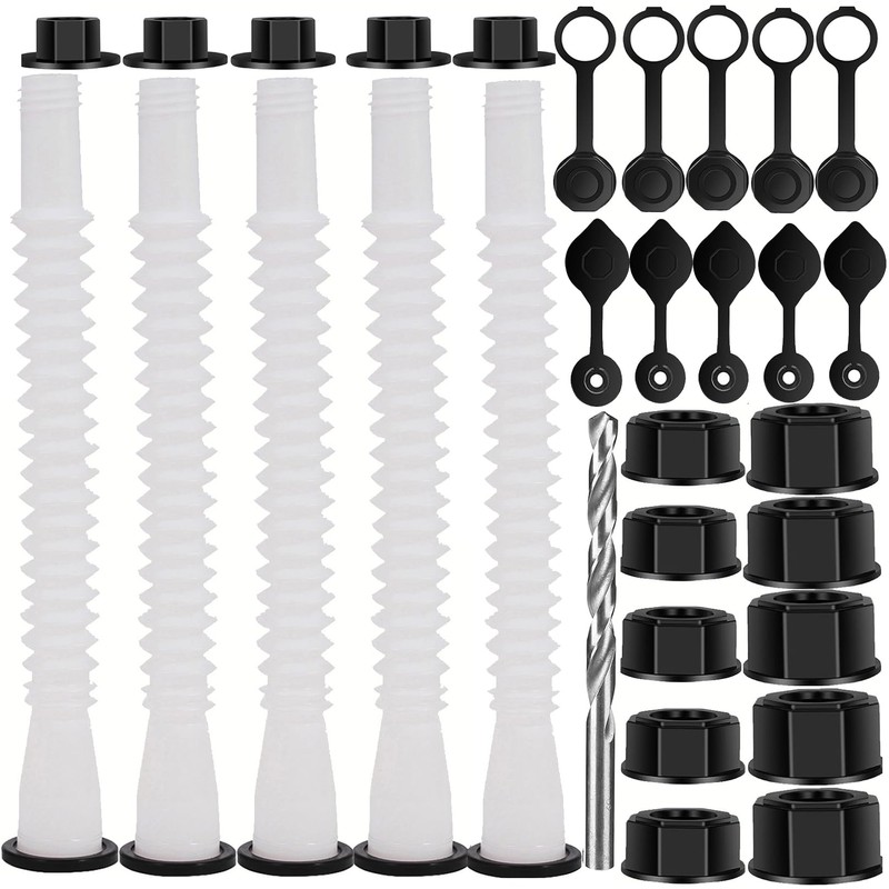 - Update your old cans with Complete spout kit includes: (5) gas can filler nozzle, (5) spout cap, (5) "O" ring gasket, (10) base caps, (5) push-in vent cap,(5)rear vent cap,(1) drill bit