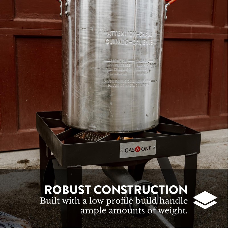 Single Burner Propane Stove C Be Prepared for Unforgettable AdventuresOur propane burners for outdoor cooking were designed for enhanced performance and efficient cooking regardless of your location! The Gas One single burner propane stove is the perfect solution for outdoor cooking, featuring a portable but sturdy construction with a high heat output and complete hose assembly that will accommodate to all your cooking and meal prep needs! The propane burner is what you need if you want to impress your loved ones with your outdoor cooking skills, as it can be used for turkey fry, brewing, boiling, cooking, frying and so much more!Still not convinced? Here are some of the amazing features of our single propane burner:1. Single burner propane stove;2. Adjustable heating via regulator knob;3. 0-20psi adjustable regulator;4. Includes a steel braided hose;5. Sturdy and durable construction;6. Metal body with cast iron burners;7. High heat output;8. Ideal for camping, outdoor cooking, fishing, emergency preparedness;9. Leakproof connection to the propane tank;10. Dimensions: 15.5 x 15.x 12-inch;Make your outdoor cooking more enjoyable with our single burner propane stove!