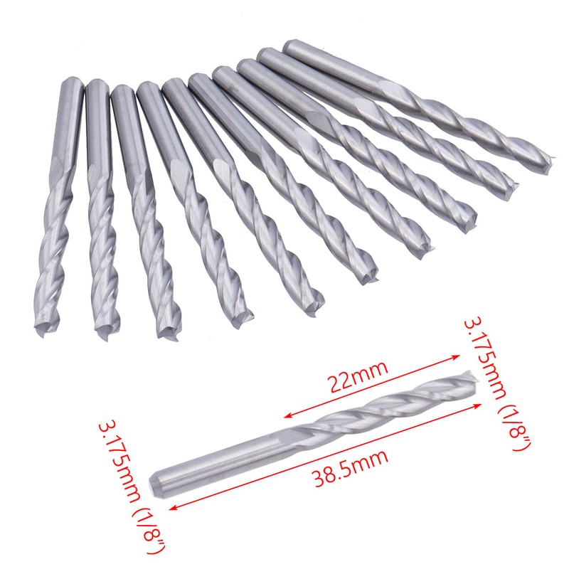 - Cutting Diameter: 3.175mm (1/8"); Cutting Length: 22mm; Total length: 38.5mm. Shank: 3.175mm (1/8"). Number of Flutes: 3 Flutes.