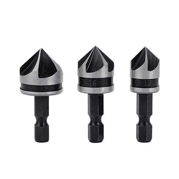Gasea 3pcs 1/4 Inch Hex Shank 5 Flute 90 Degree Chamfering Countersink Drill Bit Set 12mm 16mm 19mm