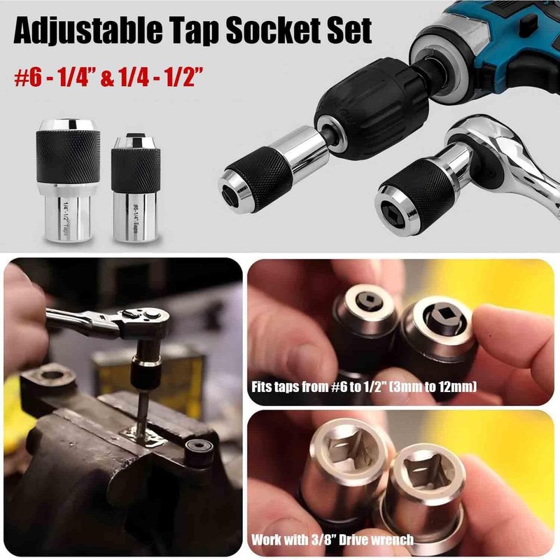 • Adjustable Tap Socket Set: Fits taps from #6 to 1/2" with quick-switch adjustable jaws.